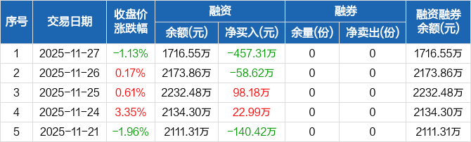 融资方面,当日融资买入735.62万元,融资偿还1192.93万元,融资净偿还457.31万元。融券方面,融券卖出0份,融券偿还0份,融券余量0份,融券余额0元。融资融券余额合计1716.55万元。