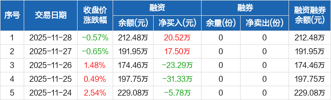 融资方面,当日融资买入144.46万元,融资偿还123.94万元,融资净买入20.52万元。融券方面,融券卖出0份,融券偿还0份,融券余量0份,融券余额0元。融资融券余额合计212.48万元。