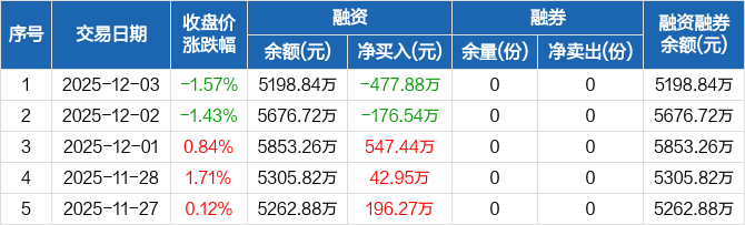 融资方面,当日融资买入436.36万元,融资偿还914.23万元,融资净偿还477.88万元。融券方面,融券卖出0份,融券偿还0份,融券余量0份,融券余额0元。融资融券余额合计5198.84万元。