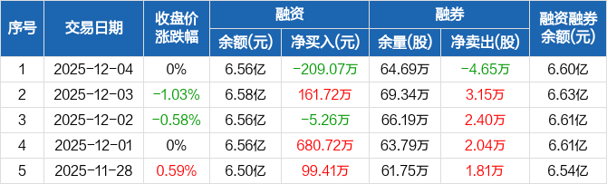 财达证券融资融券信息显示,2025年12月4日融资净偿还209.07万元;融资余额6.56亿元,较前一日下降0.32%
