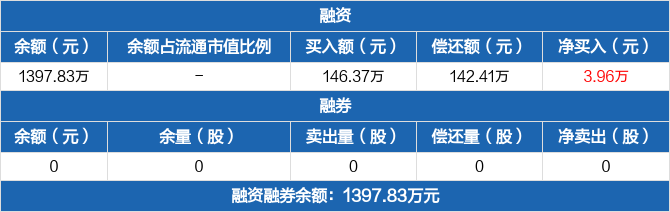 融资方面,当日融资买入146.37万元,融资偿还142.41万元,融资净买入3.96万元,连续3日净买入累计230.74万元。融券方面,融券卖出0份,融券偿还0份,融券余量0份,融券余额0元。融资融券余额合计1397.83万元。