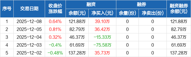 融资方面,当日融资买入274.56万元,融资偿还235.47万元,融资净买入39.1万元。融券方面,融券卖出0份,融券偿还0份,融券余量0份,融券余额0元。融资融券余额合计121.88万元。