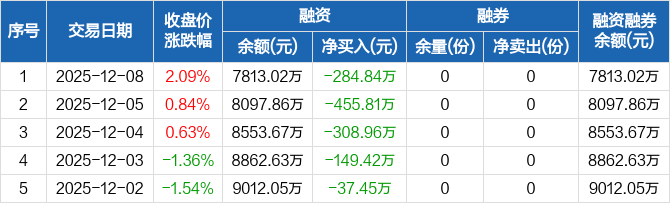 融资方面,当日融资买入1483.55万元,融资偿还1768.39万元,融资净偿还284.84万元,连续5日净偿还累计1236.49万元。融券方面,融券卖出0份,融券偿还0份,融券余量0份,融券余额0元。融资融券余额合计7813.02万元。