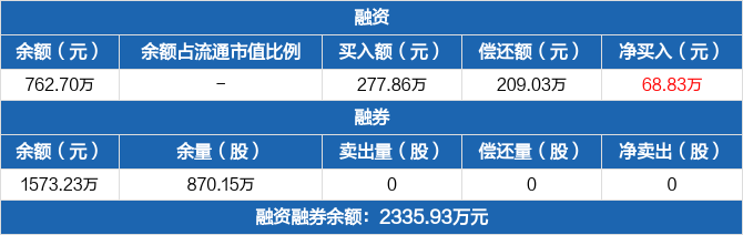 融资方面,当日融资买入277.86万元,融资偿还209.03万元,融资净买入68.83万元。融券方面,融券卖出0份,融券偿还0份,融券余量870.15万份,融券余额1573.23万元。融资融券余额合计2335.93万元。