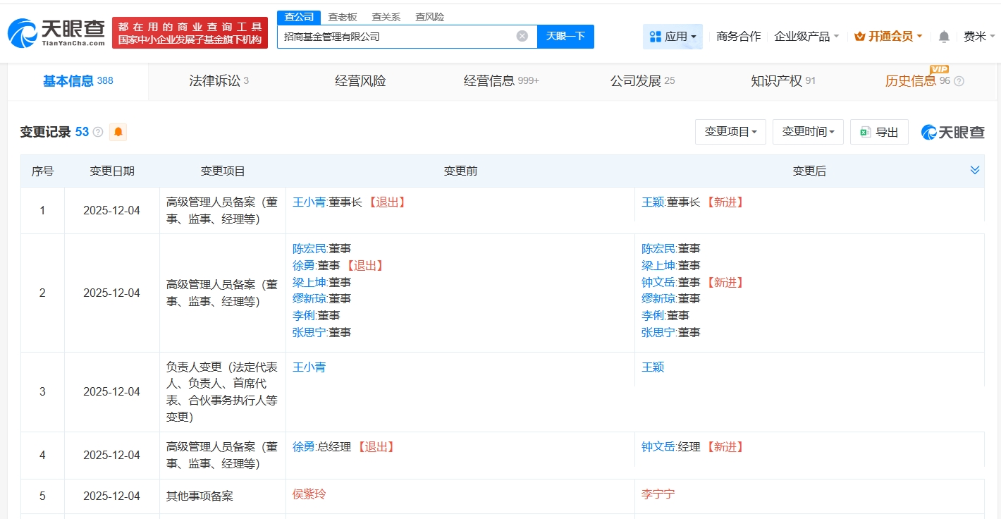 南方财经12月9日电,天眼查App显示,近日,招商基金管理有限公司发生工商变更,王小青卸任该公司法定代表人、董事长,由王颖接任,徐勇卸任董事、总经理,钟文岳接任董事并担任经理。该公司成立于2002年12月,注册资本13.1亿人民币,经营范围包括基金管理业务、发起设立基金等,由招商银行(600036)、招商证券(600999)共同持股。据媒体报道,此前,招商基金发布高级管理人员变更公告称,王颖自2025年11月27日起任招商基金董事长,公司总经理钟文岳不再代任董事长职务。