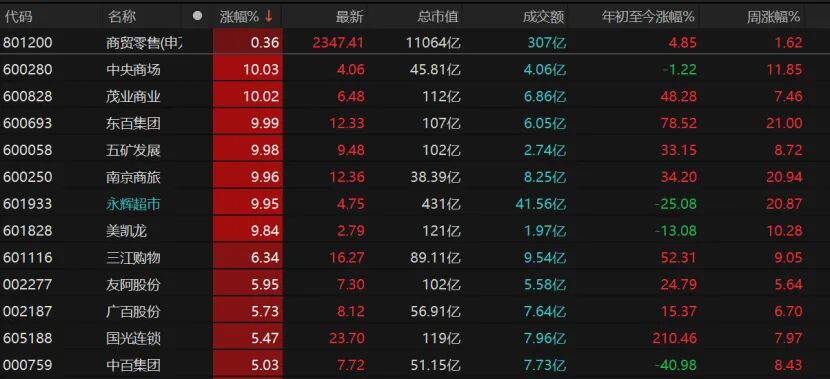 商贸零售板块逆市抬头,中央商场、茂业商业、东百集团、五矿发展、南京商旅、永辉超市、美凯龙7只相关个股涨停。