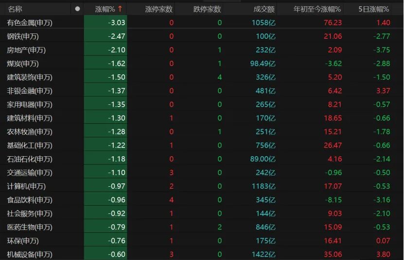 有色金属、钢铁、房地产板块领跌,煤炭、建筑装饰、家用电器、建筑材料等板块均跌逾1%,非银金融板块今日回落。