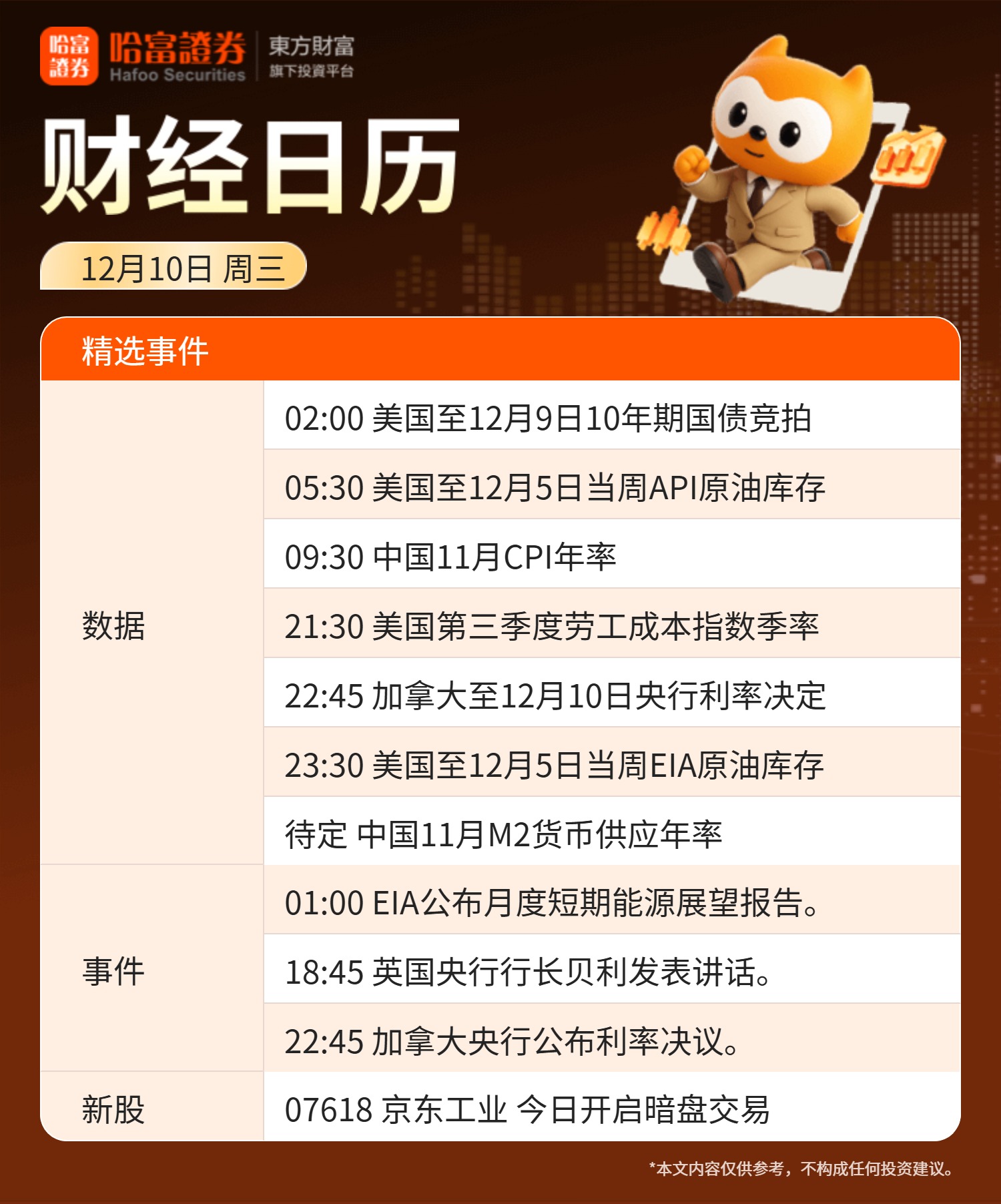 美股市场:美股三大指数12月09日收盘涨跌不一。截至收盘,道琼斯工业平均指数比前一交易日下跌179.03点,收于47560.29点,跌幅为0.38%;标准普尔500种股票指数下跌6.0点,收于6840.51点,跌幅为0.09%;纳斯达克综合指数上涨30.59点,收于23576.49点,涨幅为0.13%。
