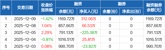 融资方面,当日融资买入529.71万元,融资偿还217.65万元,融资净买入312.06万元。融券方面,融券卖出0份,融券偿还0份,融券余量0份,融券余额0元。融资融券余额合计1169.72万元。