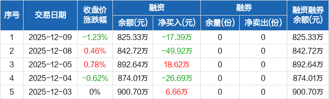 融资方面,当日融资买入55.81万元,融资偿还73.2万元,融资净偿还17.39万元。融券方面,融券卖出0份,融券偿还0份,融券余量0份,融券余额0元。融资融券余额合计825.33万元。