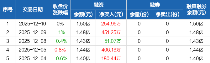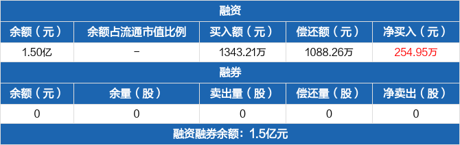 融资方面,当日融资买入1343.21万元,融资偿还1088.26万元,融资净买入254.95万元。融券方面,融券卖出0份,融券偿还0份,融券余量0份,融券余额0元。融资融券余额合计1.5亿元。