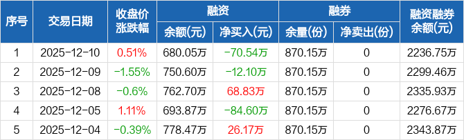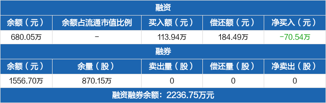 融资方面,当日融资买入113.94万元,融资偿还184.49万元,融资净偿还70.54万元。融券方面,融券卖出0份,融券偿还0份,融券余量870.15万份,融券余额1556.7万元。融资融券余额合计2236.75万元。