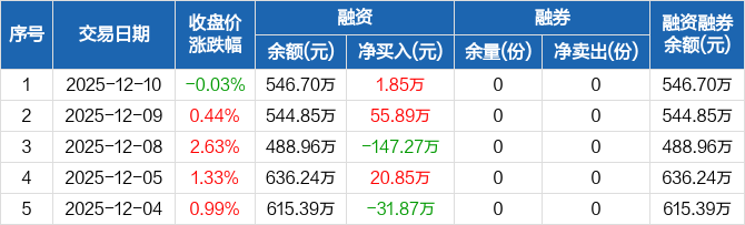融资方面,当日融资买入78.25万元,融资偿还76.41万元,融资净买入1.85万元。融券方面,融券卖出0份,融券偿还0份,融券余量0份,融券余额0元。融资融券余额合计546.7万元。