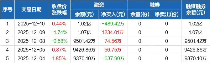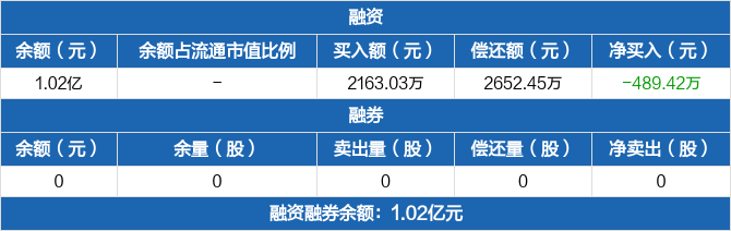 融资方面,当日融资买入2163.03万元,融资偿还2652.45万元,融资净偿还489.42万元。融券方面,融券卖出0份,融券偿还0份,融券余量0份,融券余额0元。融资融券余额合计1.02亿元。