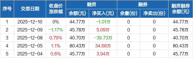 融资方面,当日融资买入23.9万元,融资偿还24.91万元,融资净偿还1.01万元。融券方面,融券卖出0份,融券偿还0份,融券余量0份,融券余额0元。融资融券余额合计44.77万元。