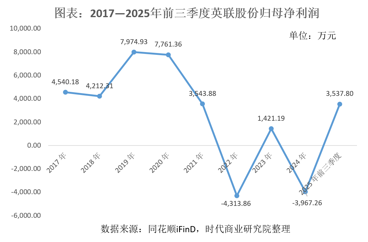 但光鲜的营收背后,是持续承压的盈利。自2019年创下归母净利润新高后,英联股份归母净利润震荡下行,2022年、2024年先后出现亏损,即便在盈利的2023年,17.47亿元营收也仅对应1421.19万元净利润。