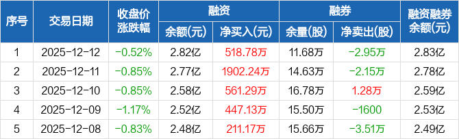 融资方面,当日融资买入1773.85万元,融资偿还1255.07万元,融资净买入518.78万元,连续5日净买入累计3640.61万元。融券方面,融券卖出1000股,融券偿还3.05万股,融券余量11.68万股,融券余额67.39万元。融资融券余额合计2.83亿元。