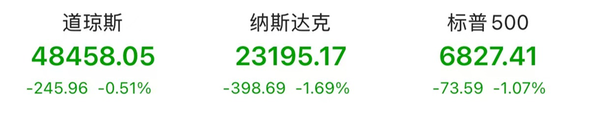 截至收盘,道指跌0.51%,报48458.05点;纳指跌1.69%,报23195.17点;标普500指数跌1.07%,报6827.41点。