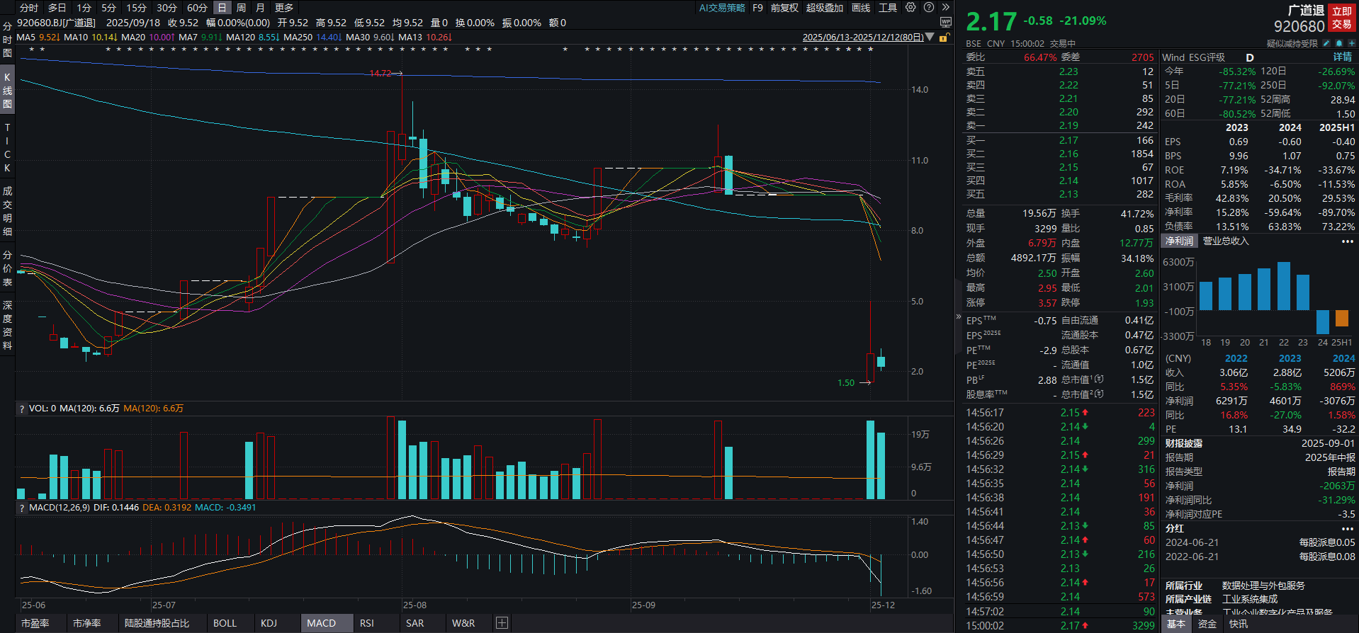 12月10日,*ST广道公告,公司股票将于2025年12月11日进入退市整理期,退市整理期为15个交易日,预计最后交易日为2025年12月31日。退市整理期首日,股票交易无价格涨跌幅限制,此后每日涨跌幅限制为30%。公司股票终止上市后,将转入全国股转系统设立并代为管理的两网公司及退市公司板块进行转让。