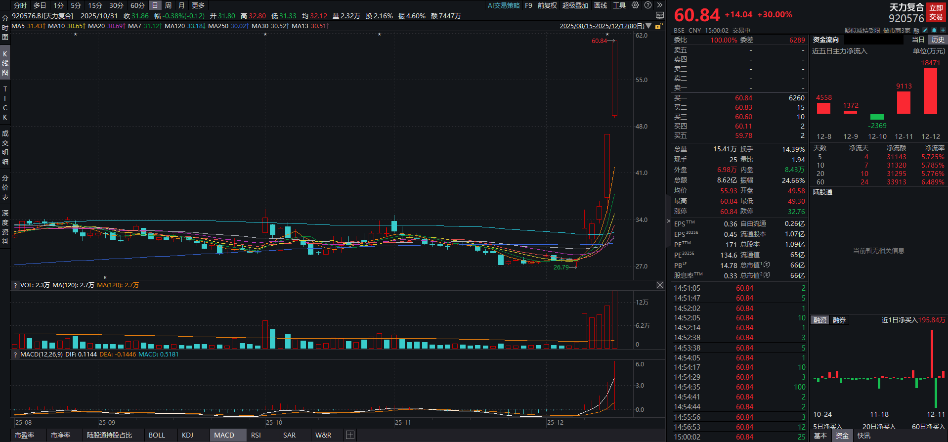 在核聚变和商业航天等热门概念的催化下,天力复合的股价过去一周连收五个阳线,累计涨幅超117%,其中12月11日-12日连续两日30CM涨停。