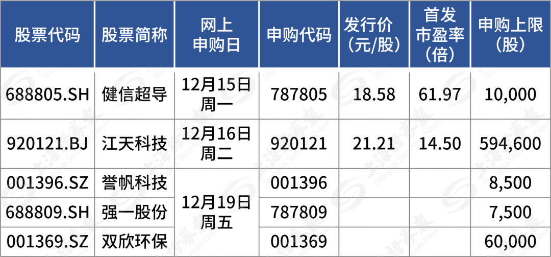 据目前安排,若无变化,下周(12月15日至19日)有5只新股可申购,包括科创板2只、深市主板2只和北交所1只。