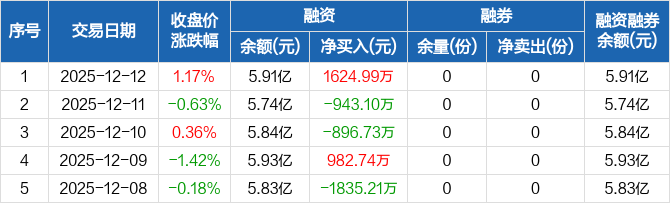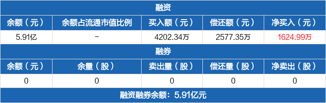 融资方面,当日融资买入4202.34万元,融资偿还2577.35万元,融资净买入1624.99万元。融券方面,融券卖出0份,融券偿还0份,融券余量0份,融券余额0元。融资融券余额合计5.91亿元。