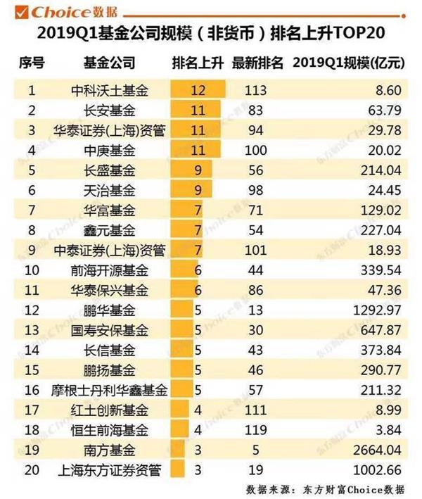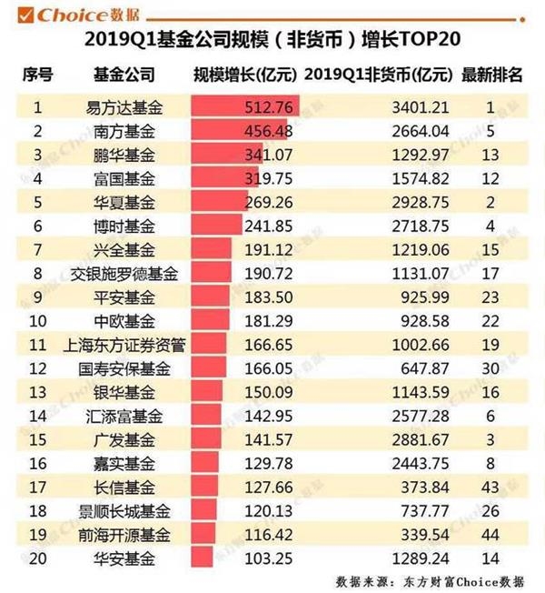 从基金公司规模(非货币)排名角度看,东方财富Choice数据统计,截至2019年一季度末,易方达基金以3401.21亿元的非货币基金规模稳居规模排行榜榜首。