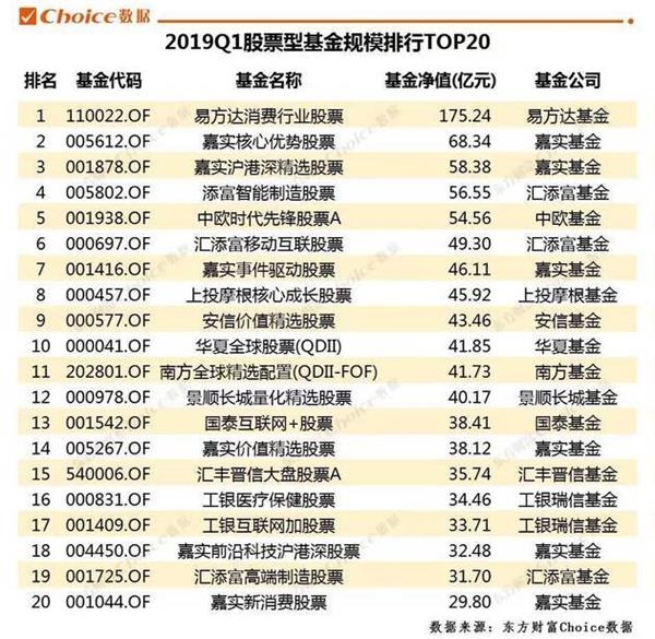 截至一季度末,单只股票型基金规模排名TOP20中,“老面孔”易方达消费行业股票以175.24亿元的基金净值稳居首位,嘉实核心优势、嘉实沪港深精选、添富智能制造以超55亿元的规模紧随其后。