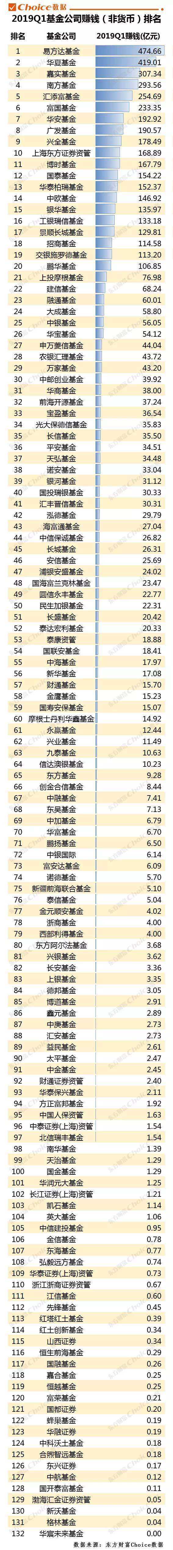 具体到各家基金公司来看,东方财富Choice数据统计,2019年一季度公募基金(非货币)投资收益排名如下:易方达基金的非货币基金以474.66亿元的盈利位居榜首,华夏基金紧随其后,一季度赚取419.01亿元排名第二,嘉实基金也在一季度赚取超过300亿元的收益,达到307.34亿元,位列第三。整体来看,20家基金公司一季度赚钱超过100亿元,所有基金公司在一季度均取得了正收益。