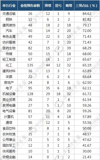 从申万一级行业来看,预增、扭亏和略增的公司家数之和占披露业绩预告公司家数比例显示,交通运输和钢铁行业占比均超过八成,分别为85%和82%;建筑装饰、汽车和有色金属排名也居前,比例均超过七成。而非银金融、休闲服务和国防军工等行业板块表现不佳,预计业绩增长公司寥寥无几。
