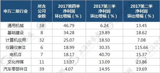 2017年第四季、第三季和第二季的环比统计数据显示,在100多个行业中,有基础建设、计算机应用、文化传媒等10个二级行业实现了连续正增长。其中,通用机械、基础建设、计算机应用等行业呈现出逐季递增的趋势。