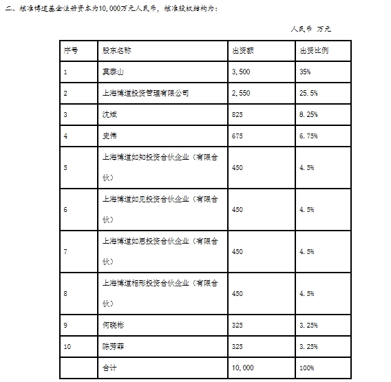 资料显示,博道基金10大股东中有5位自然人出资,均为现博道投资管理团队核心成员,其中公司董事长莫泰山占比35%,总经理沈斌持股8.25%,股票投资总监史伟持股6.75%,负责量化策略的何晓彬与债券投资总监陈芳菲持股比例为3.25%。