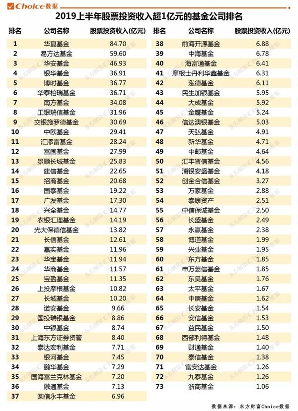 各分项收入来看,2019上半年炒股最赚钱的为华夏基金,实现股票投资收入约84.7亿元;易方达基金59.6亿元排名第二;华安基金46.93亿元位居第三。