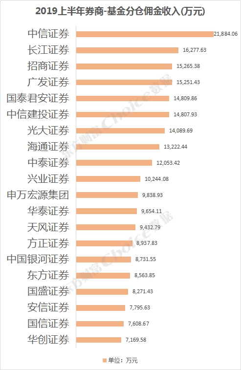 券商佣金方面,2019上半年基金分仓佣金收入最多的是中信证券,达到约2.19亿元;长江证券排名第二,总佣金约1.63亿元,佣金收入超过1.5亿元的还有招商证券和广发证券。共10家证券公司该项收入超过1亿元。