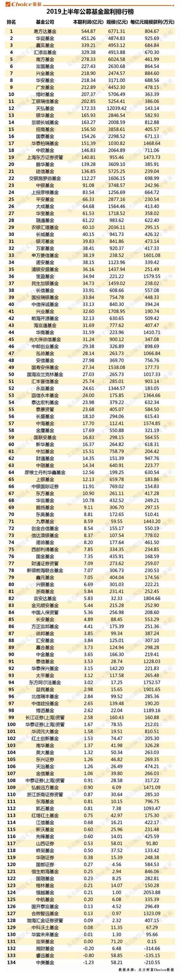 2019年上半年,134家基金公司中,绝大部分实现了盈利,仅有中庚基金、睿远基金和湘财基金3家亏损。盈利能力排名前三的公司分别为易方达基金、华夏基金和嘉实基金,分别净赚544.87亿、451.26亿、339.21亿。(注:利润指基金公司所管理的基金利润总和,归属于基金投资者,下同。)
