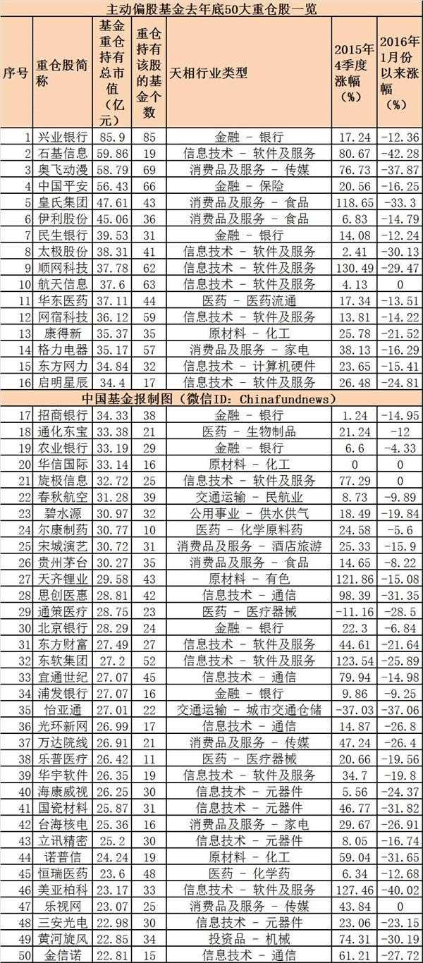 相比三季度股灾时的重创,四季度基金前五十大重仓股中仅两只出现下跌(剔除停牌的华信国际),怡亚通和通策医疗分别下跌37.03%和11.16%,以成长股为重心的融通领先在怡亚通上吃亏最甚,其持有的市值远超第二名融通互联网传媒两倍,融通基金也成为四季度重仓股中亏损最大的公司。