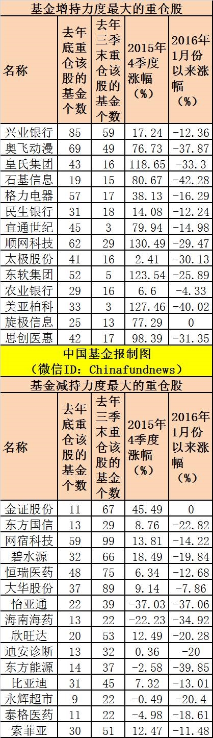 据天相数据统计,四季度基金重仓股依然以兴业银行为龙头,但传统蓝筹股已逐渐下滑,信息技术类个股纷纷冒头赶上。一些蓝筹股已被剔除出重仓股名单,此外,一些金融、能源、农业、建筑、汽车配件、化工等行业的一些个股遭到抛弃。(点此查看最新基金持仓)
