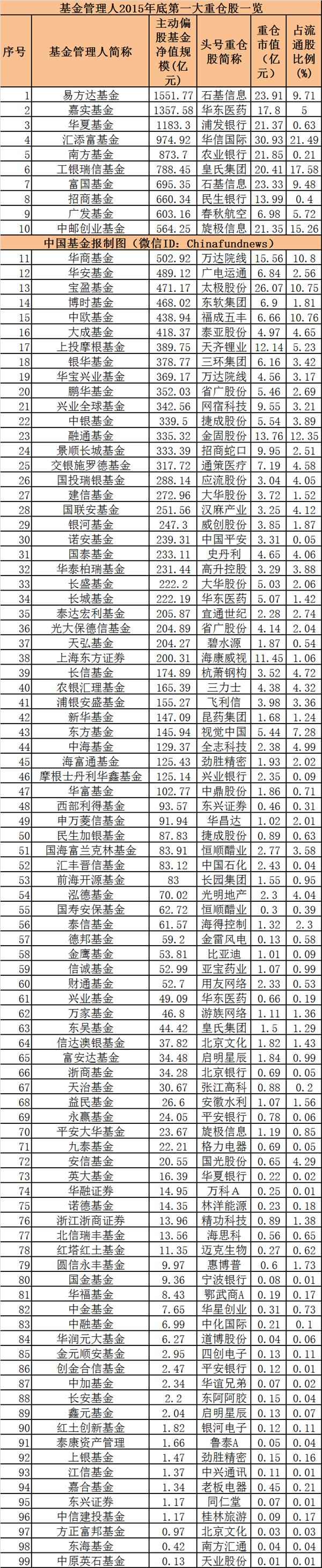 99家基金管理人第一大重仓股揭秘:易方达和富国基金大举重仓石基信息