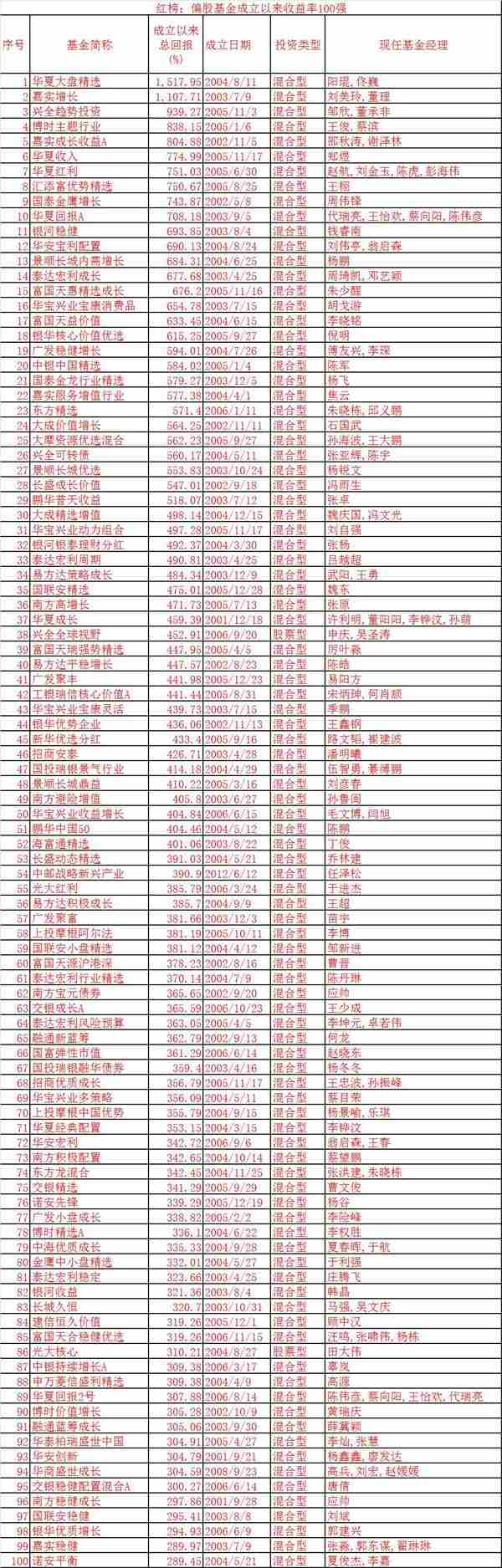 由于成立时点不同,主动偏股基金成立以来收益率差异巨大。统计显示,截止3月14日,成立以来收益率最高的100只基金收益均超过2.89倍,其中华夏大盘精选和嘉实增长成立以来收益率分别达到15.18倍和11.08倍,是为数不多的10倍基金,但遗憾的是,两只基金主要功臣王亚伟和邵健均已离任。光辉岁月难回首。另外还有兴全趋势投资、博时主题行业、嘉实成长收益等基金成立以来收益也很高,超过了8倍。