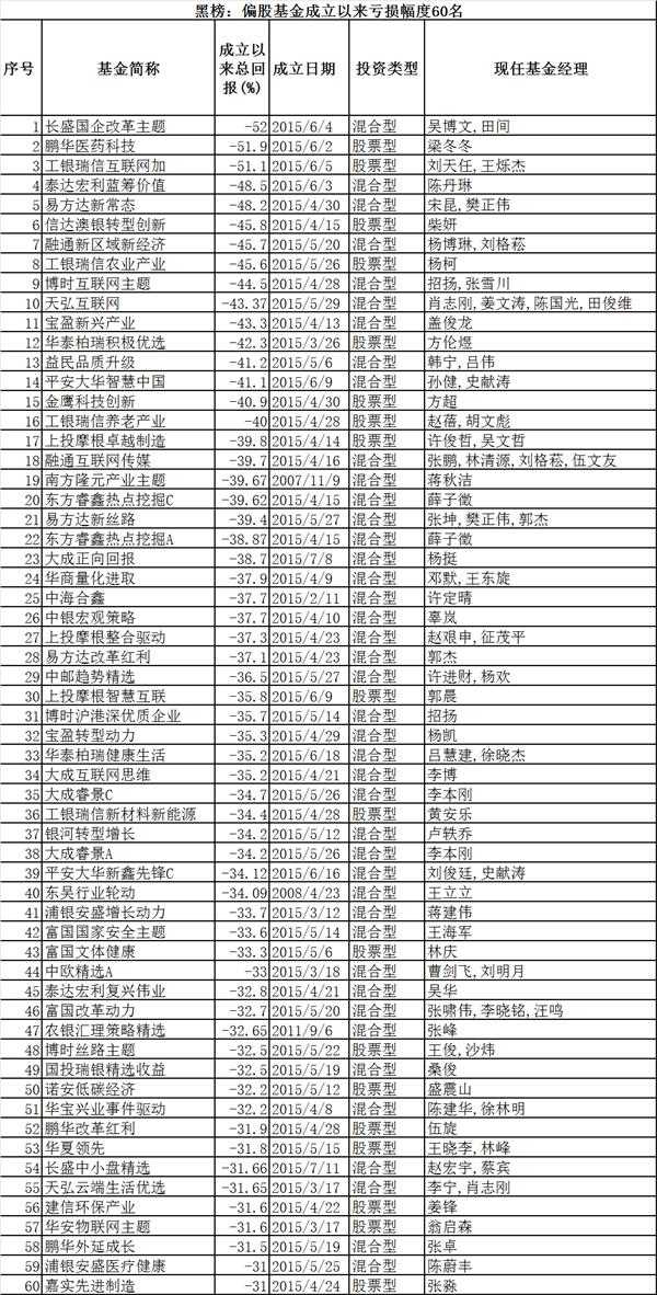 据统计,成立以来亏损幅度最高的60只主动偏股基金跌幅均达到或超过31%,长盛国企改革、鹏华医药科技和工银瑞信互联网加等三只基金成立以来亏损均超过50%,是目前亏损幅度最高的基金。