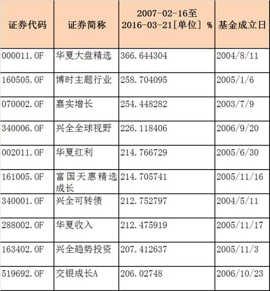 十年收益排名居前10的公募产品中,华夏的产品独占3元,兴业全球为2只,博时、嘉实、富国各有1只。
