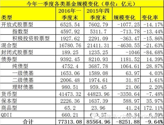 根据天相投顾对基金一季报的统计显示,包括联接基金和今年2月和3月份成立的新基金估算规模在内,一季末各类公募基金净值规模约为77313亿元,比去年底的85565亿元缩水8252亿元,缩水比例达9.64%。