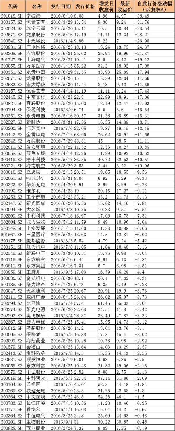 表一:今年以来实施定增的破发股票情况一览表(截止到9月29日收盘价)