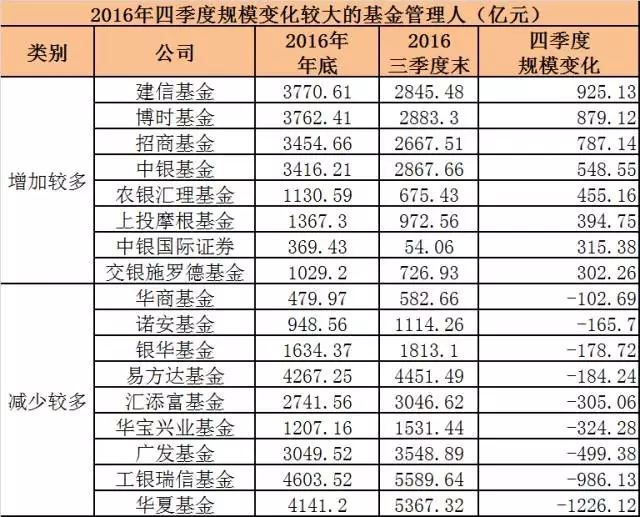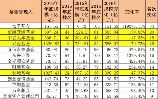 2016年底十大基金公司出现较大规模洗牌。根据天相投顾统计,截至2016年底。