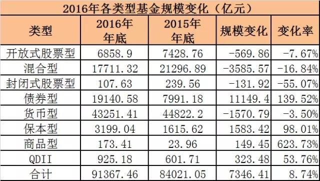 值得恭喜的是,截至2016年底,各类基金总规模突破9万亿元大关,达到9.14万亿元,全年增长7346亿元,增幅位8.74%。其中,债券型基金成为规模增长的最大功臣,年度增加11149亿元,增长1.4倍。