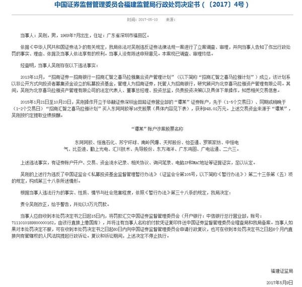 福建证监局认为, 吴刚上述行为违反了中国证监会《私募投资基金监督管理暂行办法》第二十三条第(五)项的规定,构成第三十八条所述情形。于是决定:责令吴刚改正,给予警告,并处以3万元罚款。