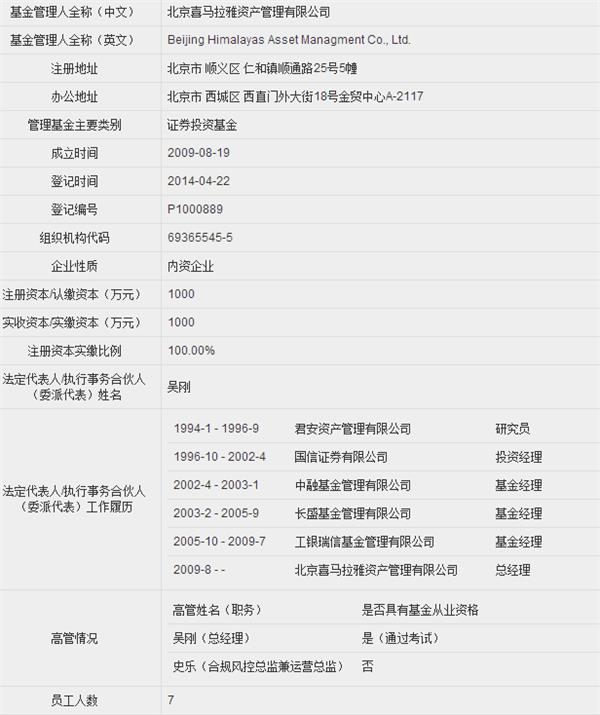 根据中国基金业协会信息,该私募成立于2009年8月。吴刚是公司的法定代表人。资料显示,该私募目前旗下无产品,基金业协会信息显示,喜马拉雅2号已清盘。公司4只产品已清盘。