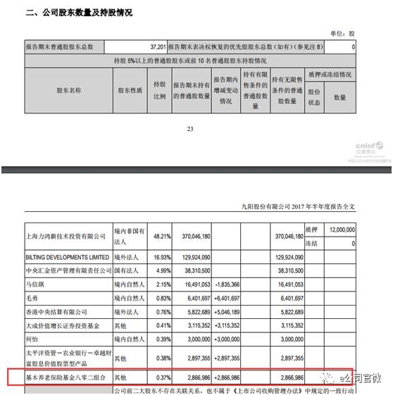九阳股份今年并未送转股份,且在一季度末,第十大股东鞍钢集团资本控股持有256.9万股,低于二季度末的第十大股东持股量,由此可以判断,基本养老保险基金八零二组合应该是二季度新进。