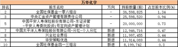 此外,股价翻倍的万华化学也颇受险资、社保资金以及基金青睐。其十大流通股东中机构资金占据7席,具体如下: