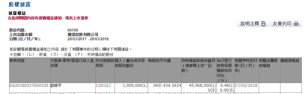 据港交所披露,腾讯控股总裁刘炽平在3月27日以平均每股434.3624港元的价格减持100万股腾讯股份。